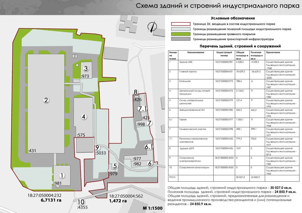 «Общая площадь зданий, строений промышленного парка составляет 30 027,0 кв.м. Полезная площадь зданий, строений Промышленного парка «Индустриальный» составляет 24 850,9 кв.м. (82,76 %). Доля полезной площади зданий, строений промышленного парка, предназначенной для размещения и ведения промышленного производства резидентов и (или) потенциальных резидентов, составляет 82,76 %%.