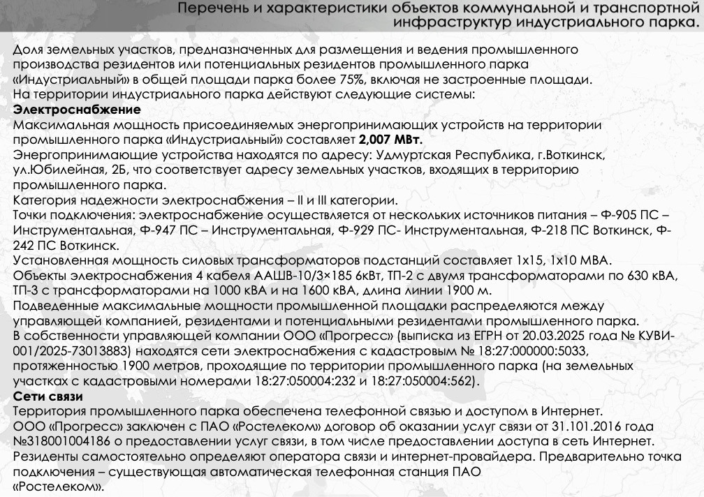 «Общая площадь зданий, строений промышленного парка составляет 30 027,0 кв.м. Полезная площадь зданий, строений Промышленного парка «Индустриальный» составляет 24 850,9 кв.м. (82,76 %). Доля полезной площади зданий, строений промышленного парка, предназначенной для размещения и ведения промышленного производства резидентов и (или) потенциальных резидентов, составляет 82,76 %%.